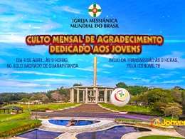 O Culto Mensal de Agradecimento Dedicado aos Jovens será realizado no dia 4 de abril, às 9 horas, no Solo Sagrado de Guarapiranga. A transmissão da Izunome.TV terá início às 8 horas.