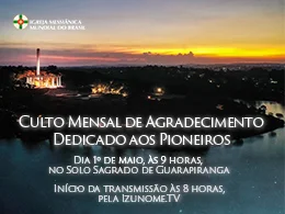 O Culto Mensal de Agradecimento dedicado aos Pioneiros será realizado no próximo dia 1º, às 9 horas (horário de Brasília).