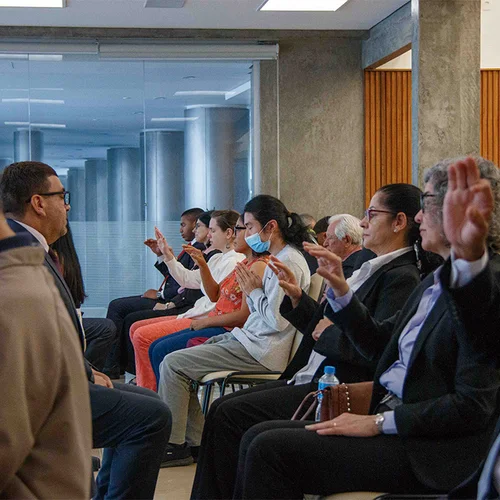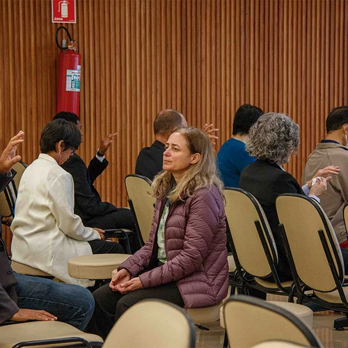 Na Sede Central da IMMB, situada na capital paulista, os colaboradores das instituições coligadas - Igreja Messiânica Mundial do Brasil (IMMB), Fundação Mokiti Okada (FMO) e Korin Empreendimentos - reúnem-se para a troca de Johrei, no momento mais oportuno durante a jornada de trabalho.