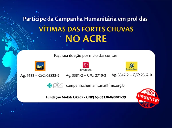 A Fundação Mokiti Okada (FMO) manifesta a sua solidariedade às vítimas das fortes chuvas que atingem o estado do Acre (AC) desde fevereiro deste ano. O excesso de precipitação levou o governo local a decretar estado de emergência em saúde pública em 17 dos 22 municípios acrianos. Diante dessa situação, a FMO, por meio da Campanha Humanitária, solicita o apoio de toda a sociedade para auxiliar os afetados por essa tragédia.