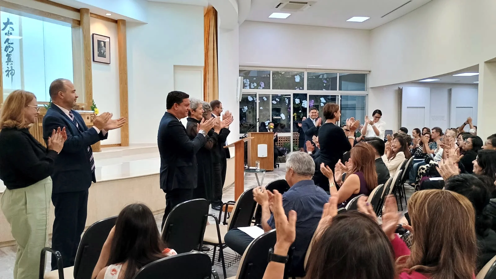 Os alunos que iniciaram sua jornada em março, refletiam orgulho e superação ao receberem seus certificados. Em suas palavras de cumprimentos aos formandos, o Ministro Danilo Polverini Locatelli, coordenador de Ensino Religioso da Igreja Vila Mariana, agradeceu os responsáveis das unidades religiosas e seus auxiliares pela confiança depositada ao inscrever seus membros e missionários nos cursos da secretaria. Parabenizou todos os instrutores que dedicaram incansavelmente para que os Escritos Divinos pudessem ser estudados e praticados pelos participantes e afirmou que o sentido pragmático da Filosofia de Meishu-Sama nos impulsiona a intensificarmos cada vez mais as práticas básicas e a não perdermos de vista o espírito de busca que nos leva ao esforço de nos tornarmos exímios aprendizes.