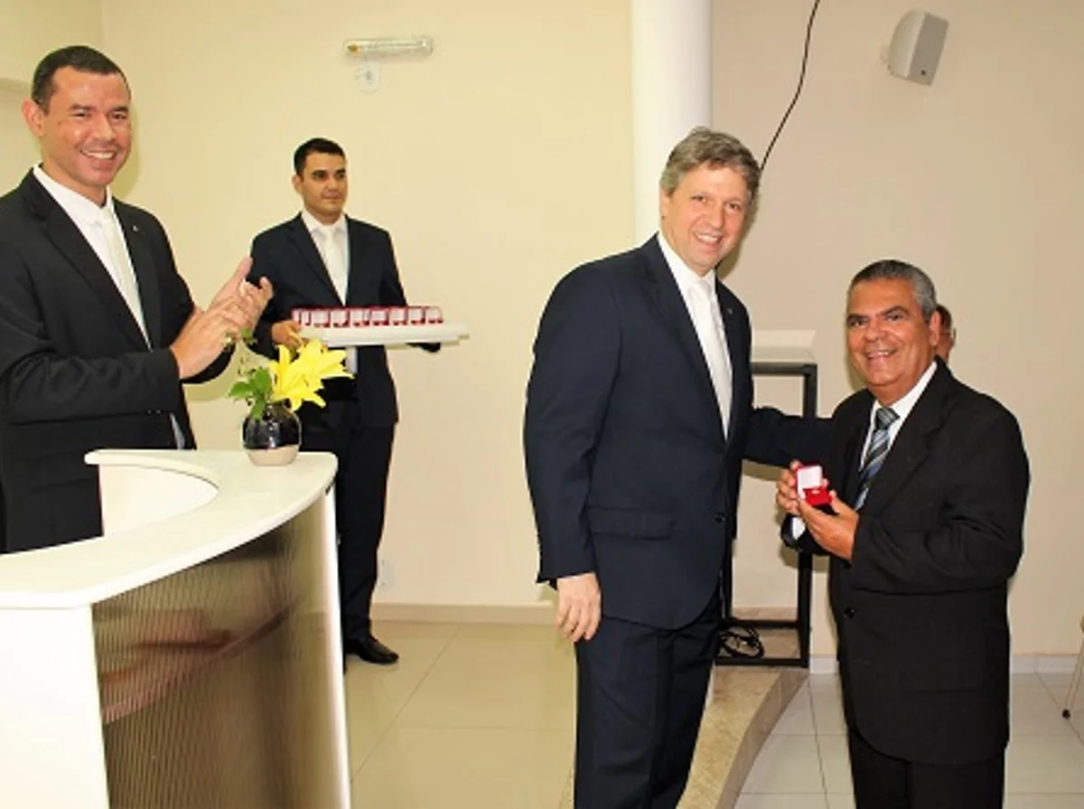 Para concluir a solenidade, o ministro Alexandre Broglio, reconhecendo a importante dedicação dos pioneiros, materializou a gratidão agraciando-os com um botton institucional.