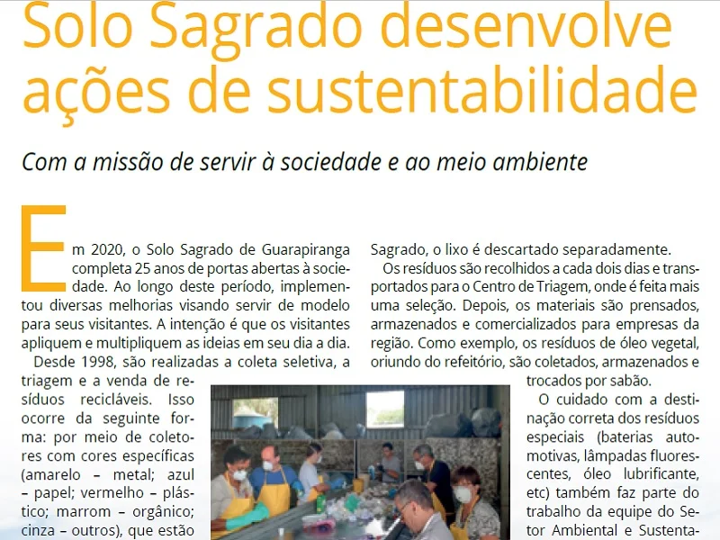 Em 2020, o Solo Sagrado de Guarapiranga completa 25 anos de portas abertas à sociedade. Ao longo deste período, implementou diversas melhorias visando servir de modelo para seus visitantes. A intenção é que os visitantes apliquem e multipliquem as ideias em seu dia a dia.